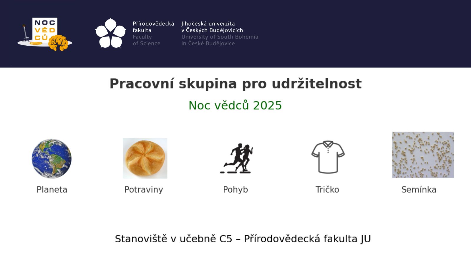 Na letošní Noci vědců se pracovní skupina pro udržitelnost z Přírodovědecké fakulty JU představí se svým interaktivním stanovištěm v učebně C5.