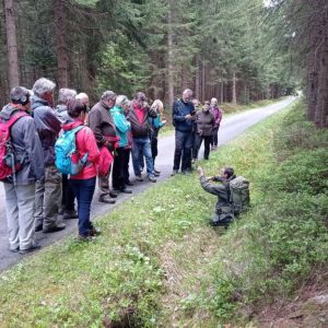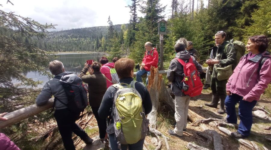 Druhá exkurze zamířila do okolí zaniklé osady Hůrka u Prášil. Hlavním cílem bylo jezero Laka – první z šumavských jezer, kde byl v roce 2019 zaznamenán návrat pstruhů. Účastníci procházeli horskými smrčinami a porovnávali místa s různými přístupy k obnově lesa. Nechyběla ani botanická pozorování a jako nečekaný bonus – komentovaná prohlídka zrekonstruované kaple na Staré Hůrce.