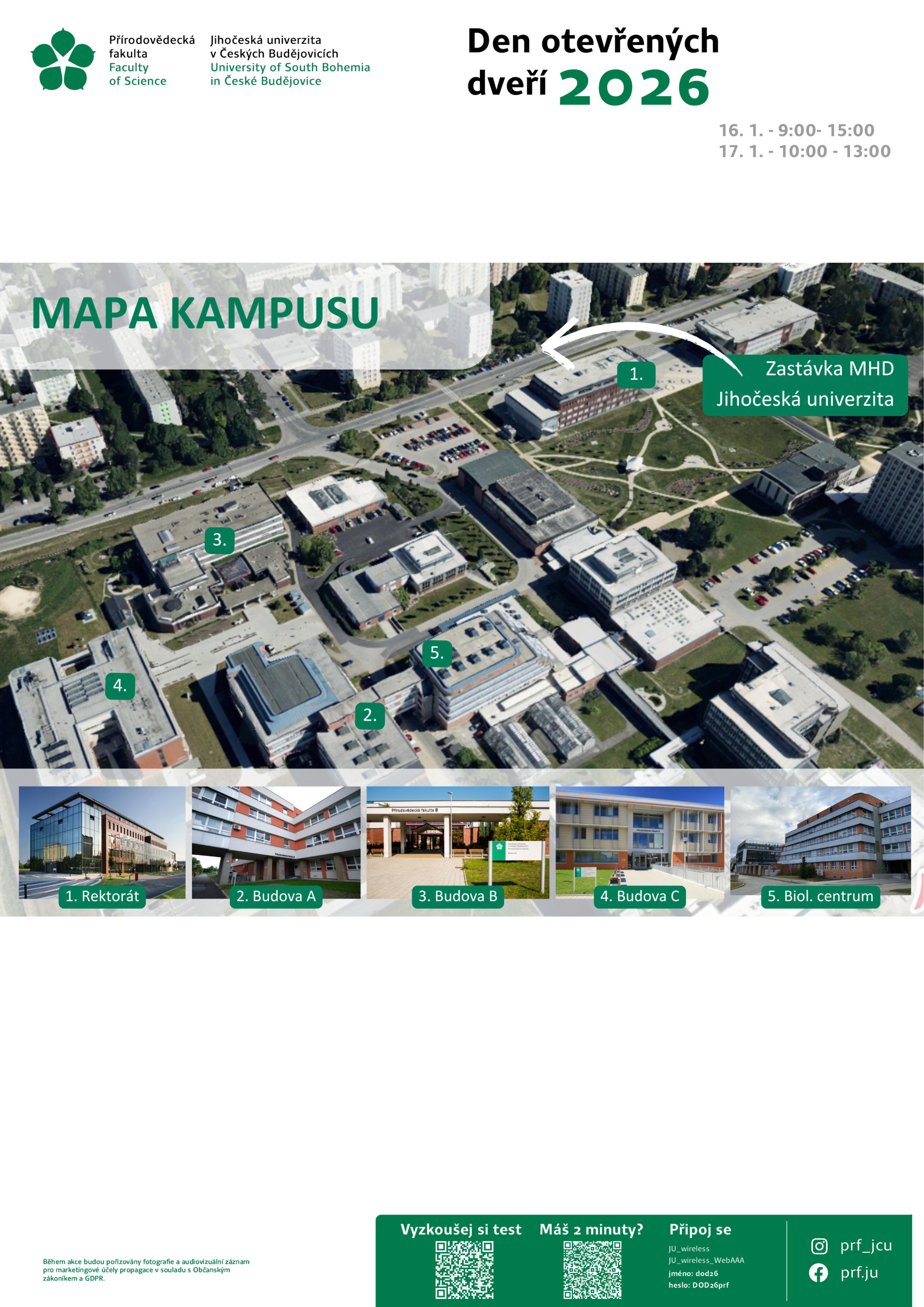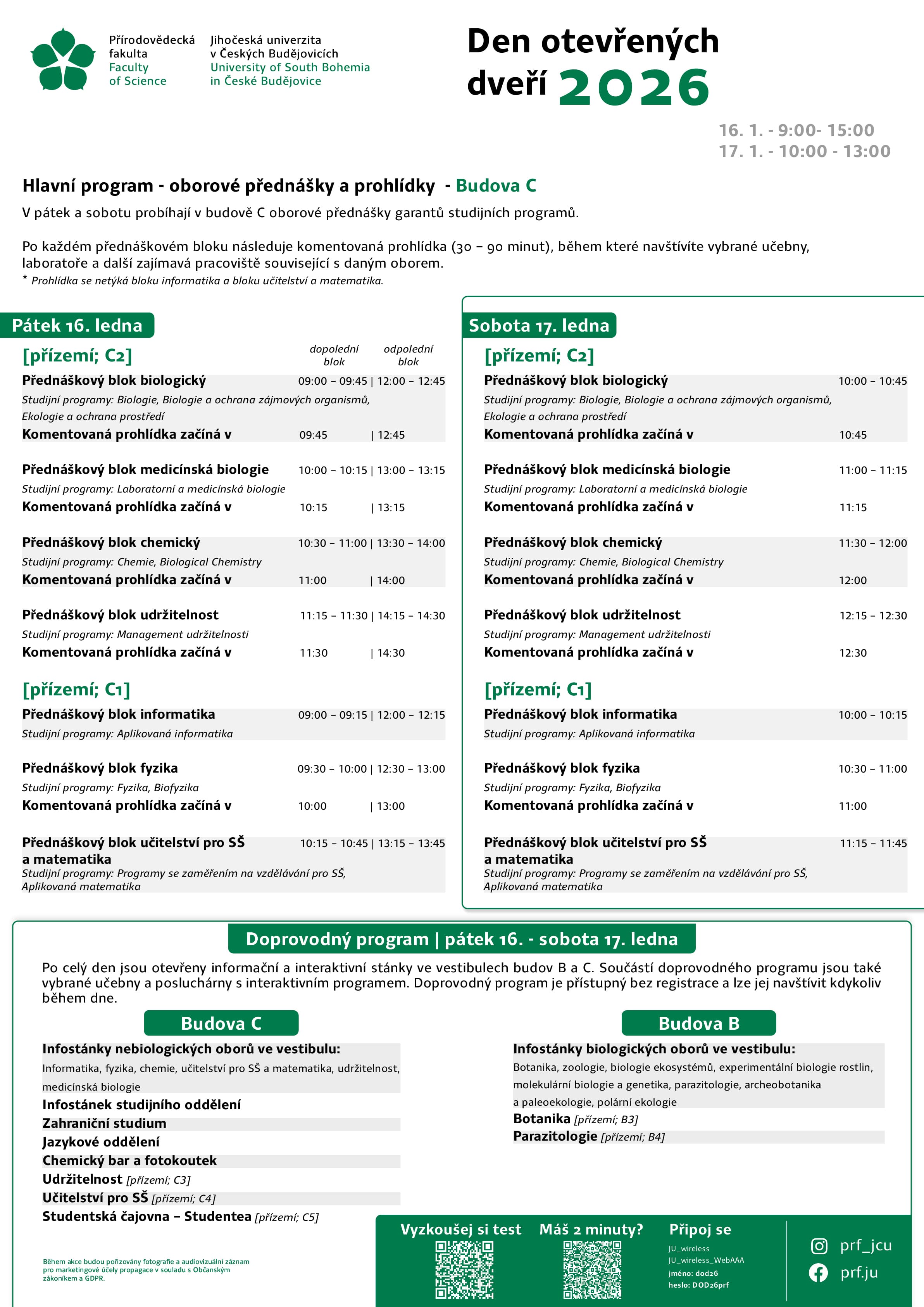 Zveme vás na Den otevřených dveří, který proběhne v pátek 16. a sobotu 17. ledna 2026 na Přírodovědecké fakultě JU.