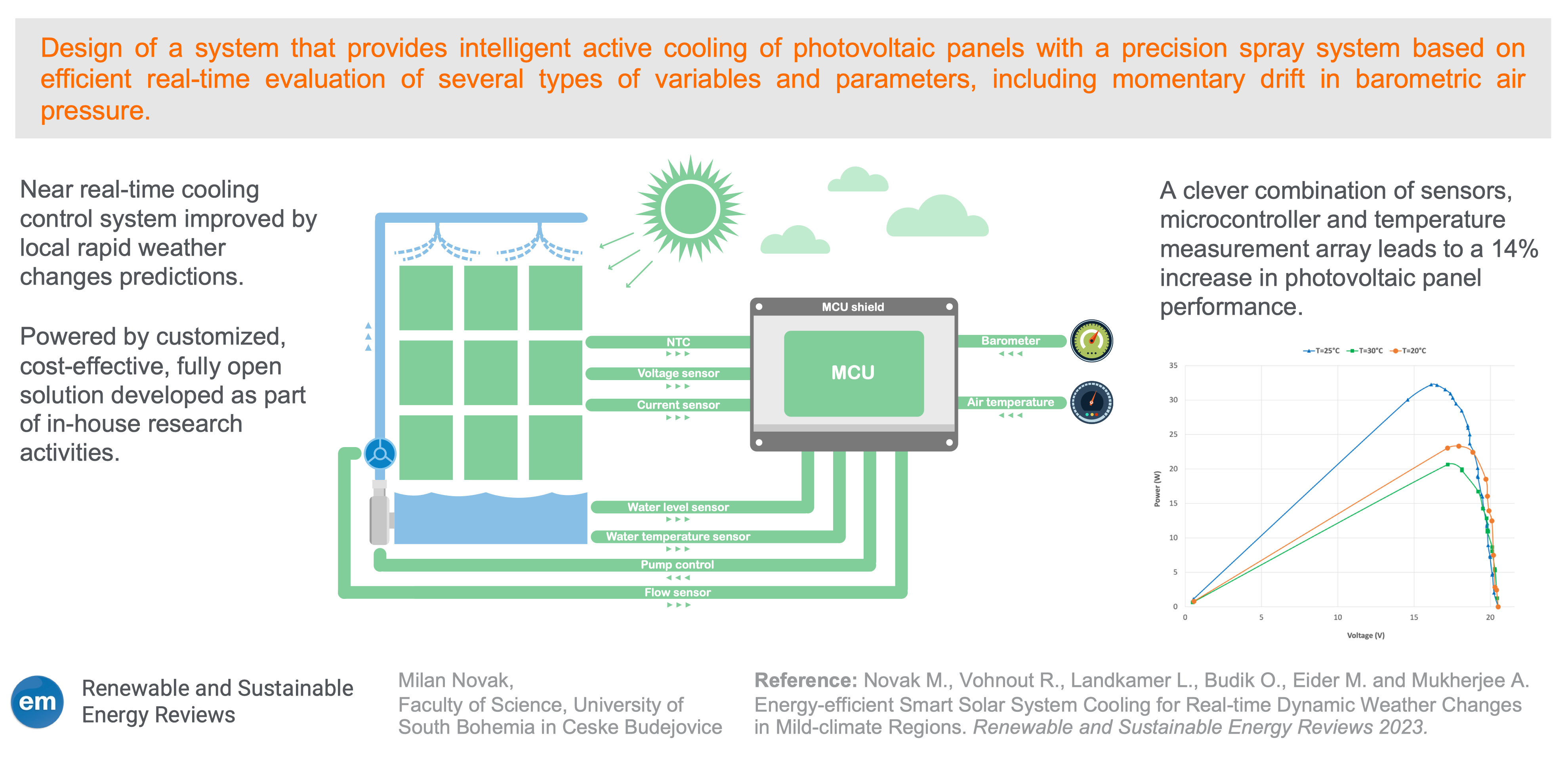 Publikace s názvem "Energy-efficient smart solar system cooling for real-time dynamic weather changes in mild-climate regions" vyšla v prestižním časopise "Renewable and Sustainable Energy Reviews" a je k dispozici v open access přístupu zde: https://doi.org/10.1016/j.rser.2023.113347