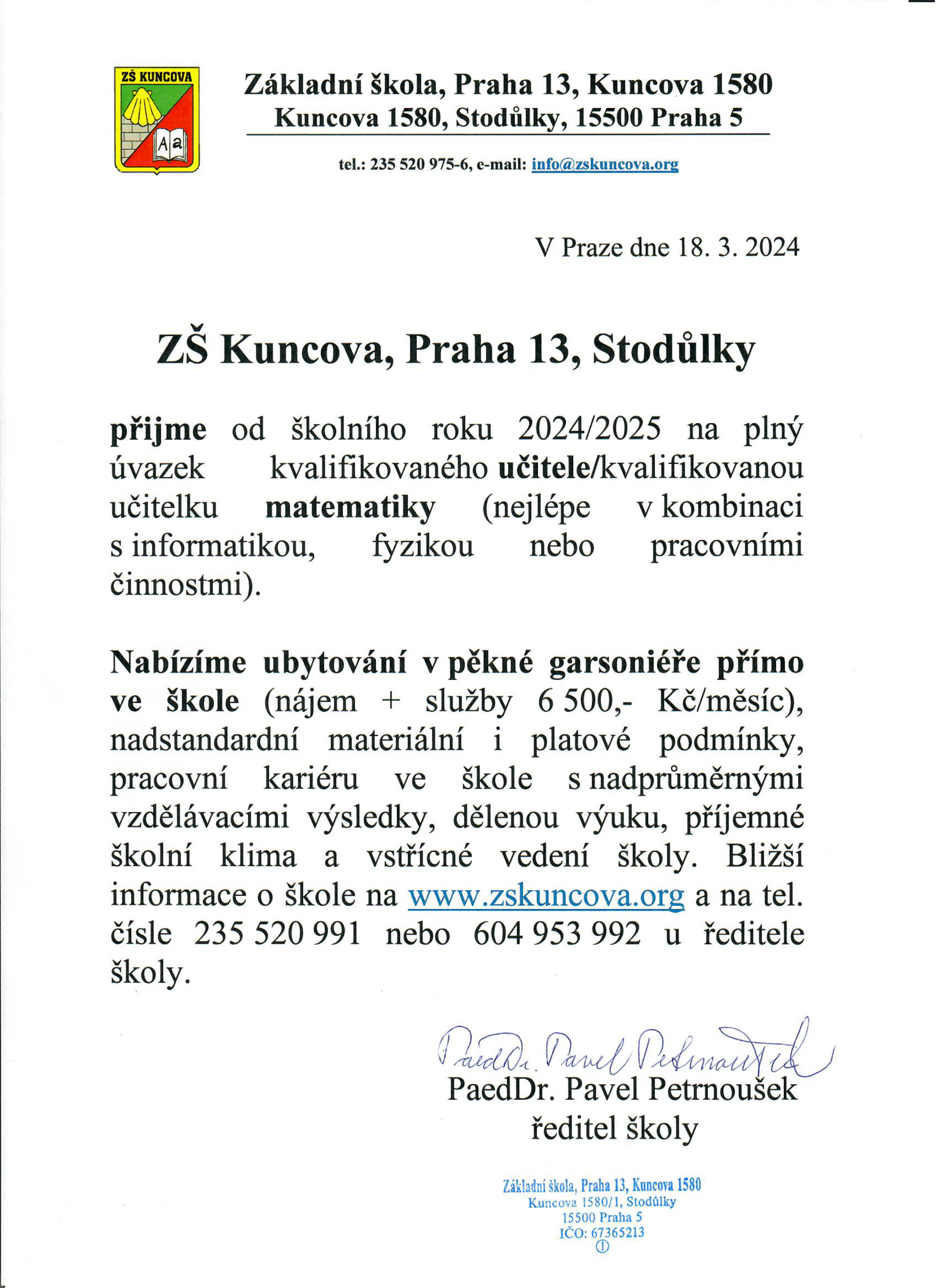 Hledá se učitel matematiky - ZŠ Kuncova, Praha 13, Stodůlky
