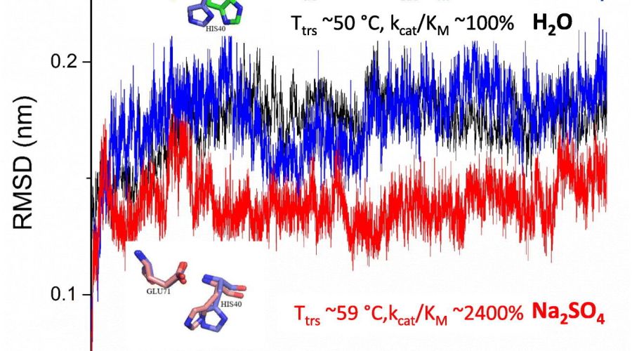 Fyzikálně chemické vlastnosti proteinů jsou nevyhnutelně ovlivňovány roztokem, v němž se nacházejí. Tento roztok působí na jejich stabilitu, dynamiku struktury proteinů a také na jejich aktivitu. Mezi jednoduché a zároveň intenzivně studované mechanismy náleží Hofmeisterův jev, který souvisí s působením různých anorganických solí na iontovou sílu roztoku. Je známo, že složení solí v roztoku ovlivňuje řadu biofyzikálních a biochemických procesů, včetně stability proteinů a jejich enzymatické aktivity. Výzkum těchto procesů má uplatnění v řadě odvětví, včetně astrobiologie, protože roztoky solí představují podstatný prvek prostředí na řady jiných světů Sluneční soustavy, počínaje Marsem.