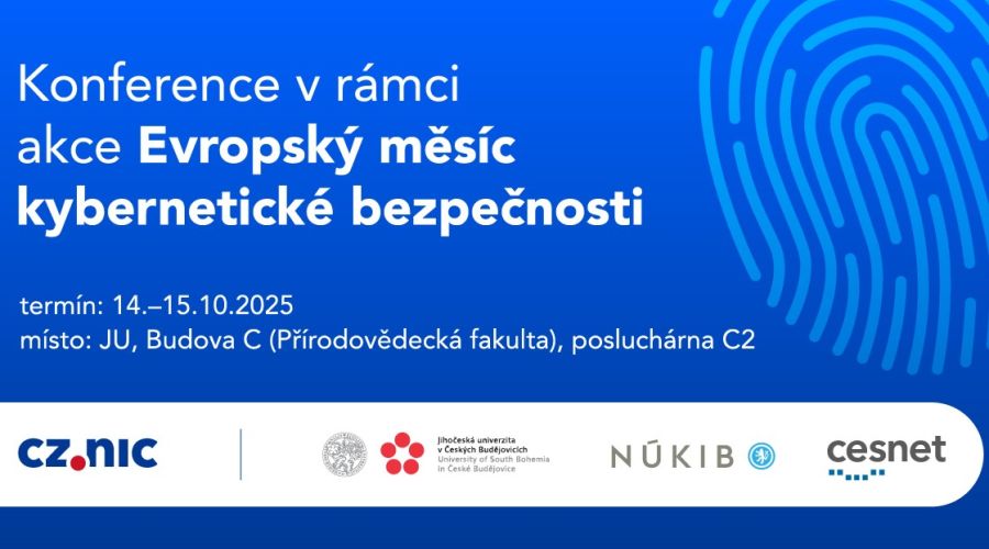 Rádi bychom Vás pozvali na konferenci v rámci Evropského měsíce kybernetické bezpečnosti, která se uskuteční ve dnech 14. - 15. 10. 2025 v posluchárně C2 v budově C na Přírodovědecké fakultě JU.