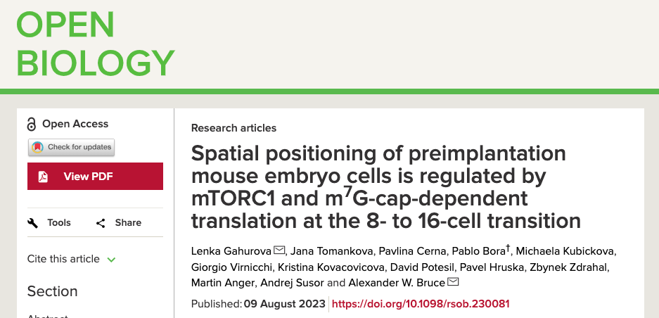 "Spatial positioning of preimplantation mouse embryo cells is regulated by mTORC1 and m7G-cap-dependent translation at the 8- to 16-cell transition" is now on-line.