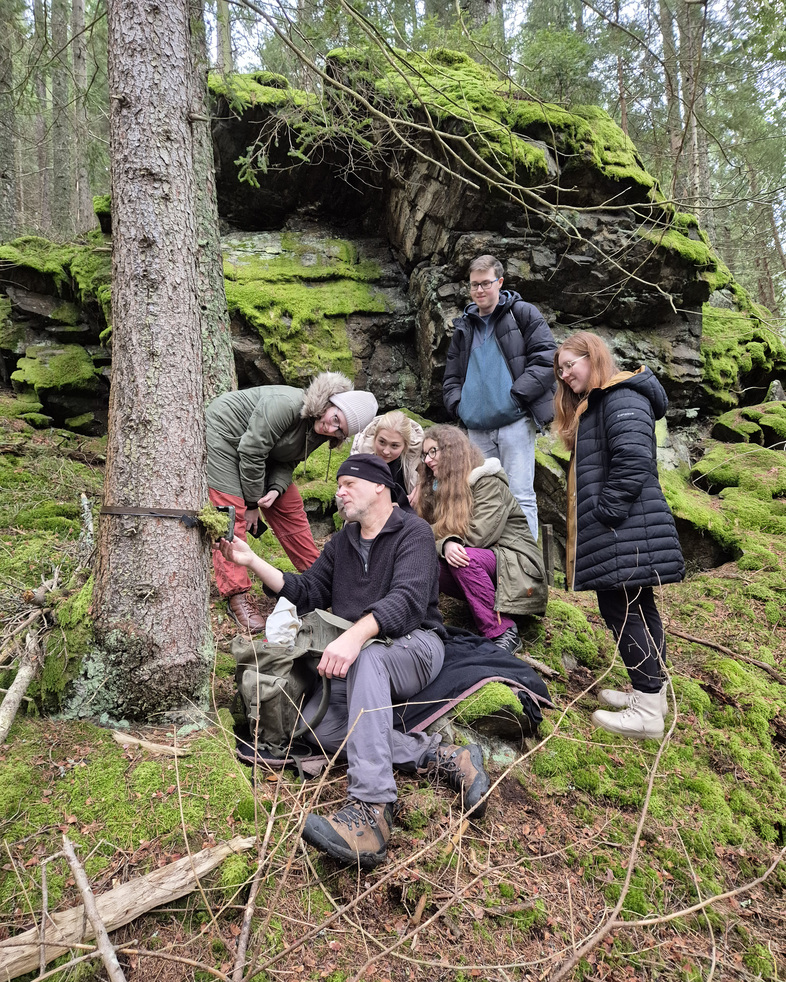 Druhou zastávkou exkurze pak byl zrádný sráz, kterým bylo nutno vyšplhat k nevšední podívané – fotopasti, pozorující kolík zaražený do země. Panem Bufkou nám však bylo již v prezentaci vysvětleno, že jde o kolík návnadný, potřený valeriánem neboli kozlíkem lékařským. Nám se bohužel nepoštěstilo, ale jindy může právě tato návnada poskytnout nejen povedené snímky otírajících se kočkovitých šelem, ale také cenný genetický materiál k analýze. Setkali jsme se rovněž i s jednou z mnoha překážek ochránců přírody, osobami sabotující výzkum, například pootočením fotopasti mimo zamýšlenou oblast záběru.
