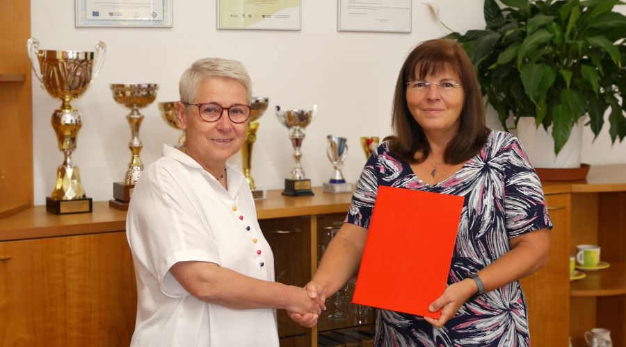 prof. Ing. Hana Šantrůčková (děkanka Přírodovědecké fakulty JU) osobně předala v pondělí 29. 8. 2022 do rukou paní ředitelky PaedDr. Eva Klasové smlouvu o zřízení fakultní školy a spolupráci mezi PřF JU a SŠ a JŠ ve Volyni.