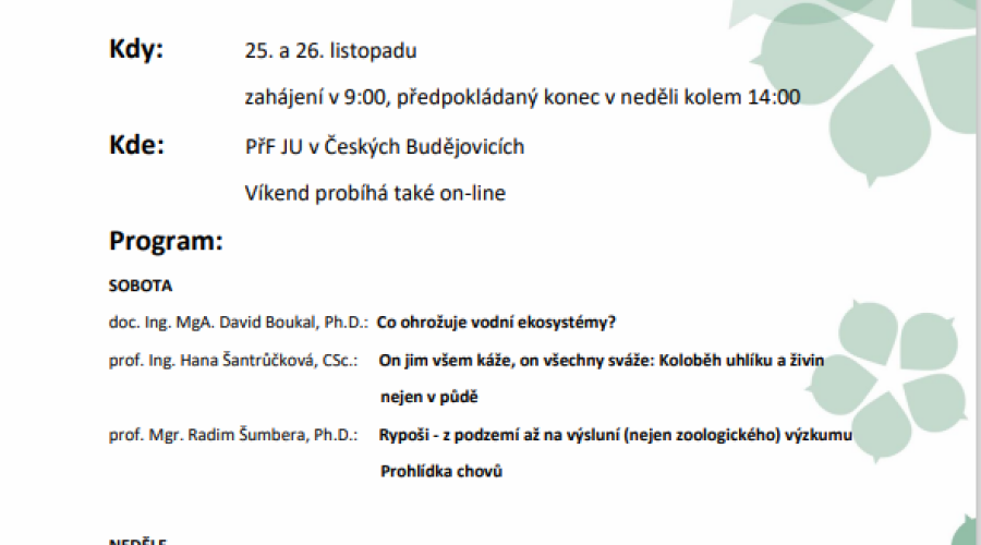 Jako každý rok budou všechny přednášky probíhat na  PřF JU v areálu kampusu JU na Branišovské v Českých Budějovicích. Přednášky tentokrát doplníme exkurzí do fakultních chovů rypošů.