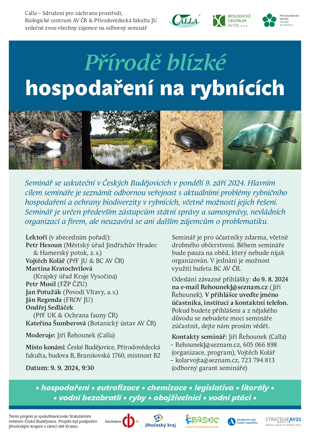 Seminář se uskuteční v Českých Budějovicích v pondělí 9. září 2024. Hlavním cílem semináře je seznámit odbornou veřejnost s aktuálními problémy rybničního hospodaření a ochrany biodiverzity v rybnících, včetně možností jejich řešení. Seminář je určen především zástupcům státní správy a samosprávy, nevládních organizací a firem, ale neuzavírá se ani dalším zájemcům o problematiku.