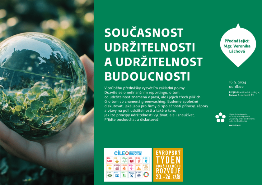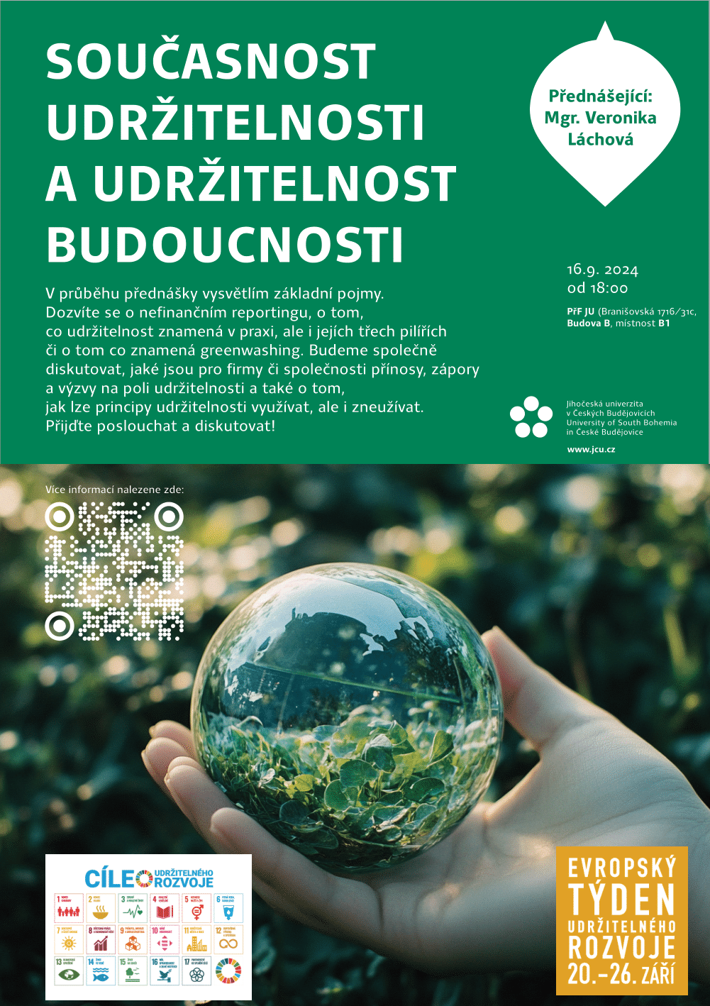 V průběhu přednášky vysvětlím základní pojmy. Dozvíte se o nefinančním reportingu, o tom, co udržitelnost znamená v praxi, ale i jejích třech pilířích či o tom co znamená greenwashing. Budeme společně diskutovat, jaké jsou pro firmy či společnosti přínosy, zápory a výzvy na poli udržitelnosti a také o tom, jak lze principy udržitelnosti využívat, ale i zneužívat. Přijďte poslouchat a diskutovat!