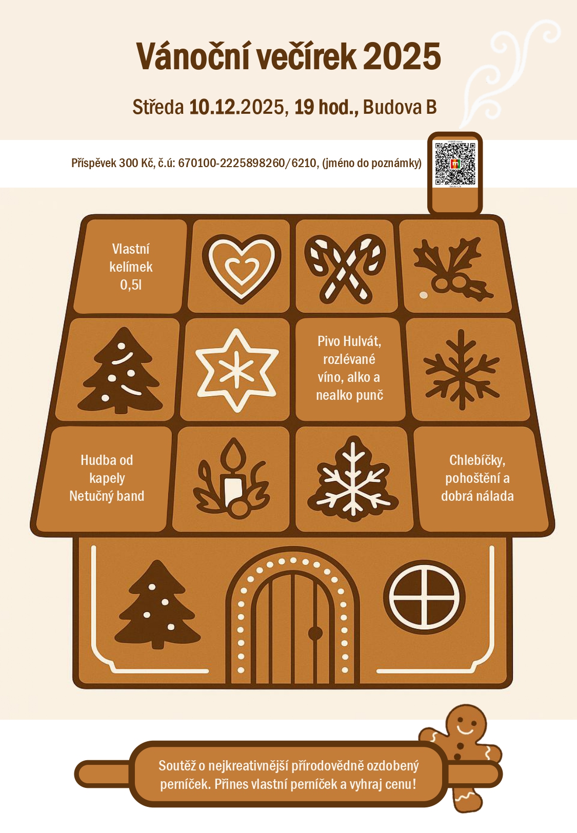 Součástí večírku bude tradiční soutěž o zajímavé ceny. Letos je výzvou upéct a ozdobit co nejoriginálnější perníček s přírodovědeckou tématikou. Hodnotíme nápad i provedení. Stačí perníček přinést a vystavit na připravené místo, kde bude zároveň možnost hlasování.