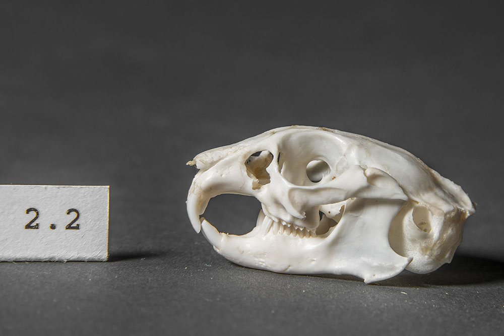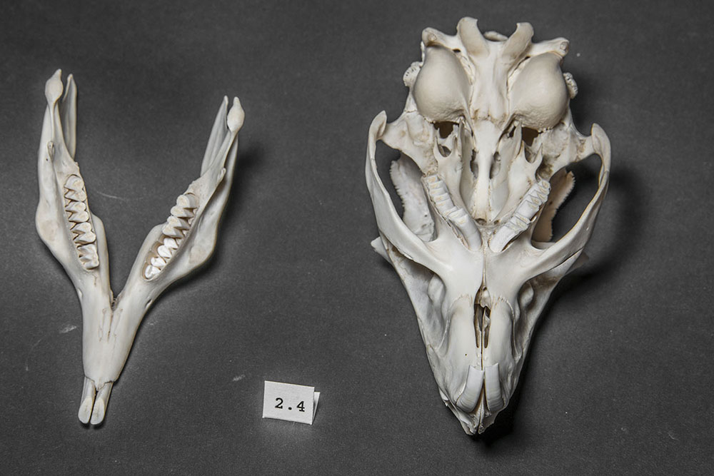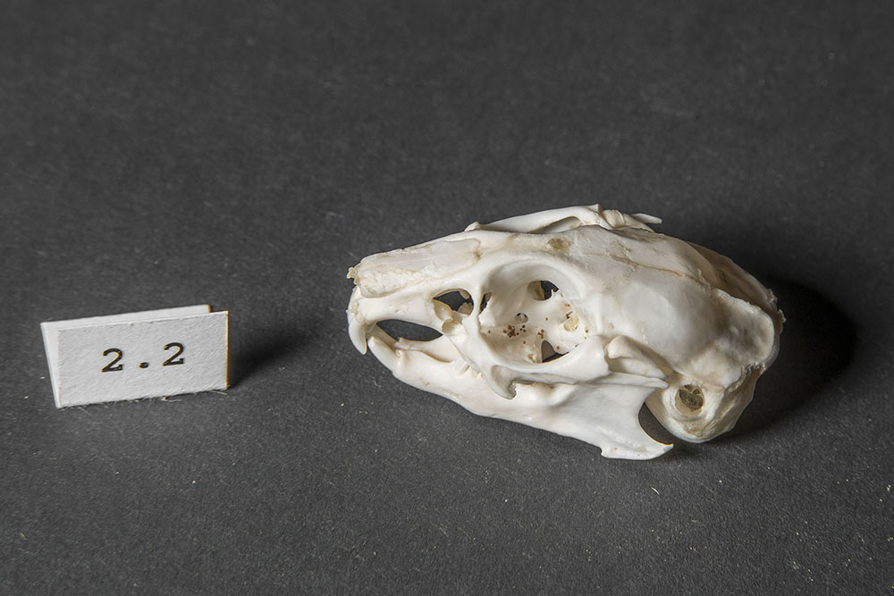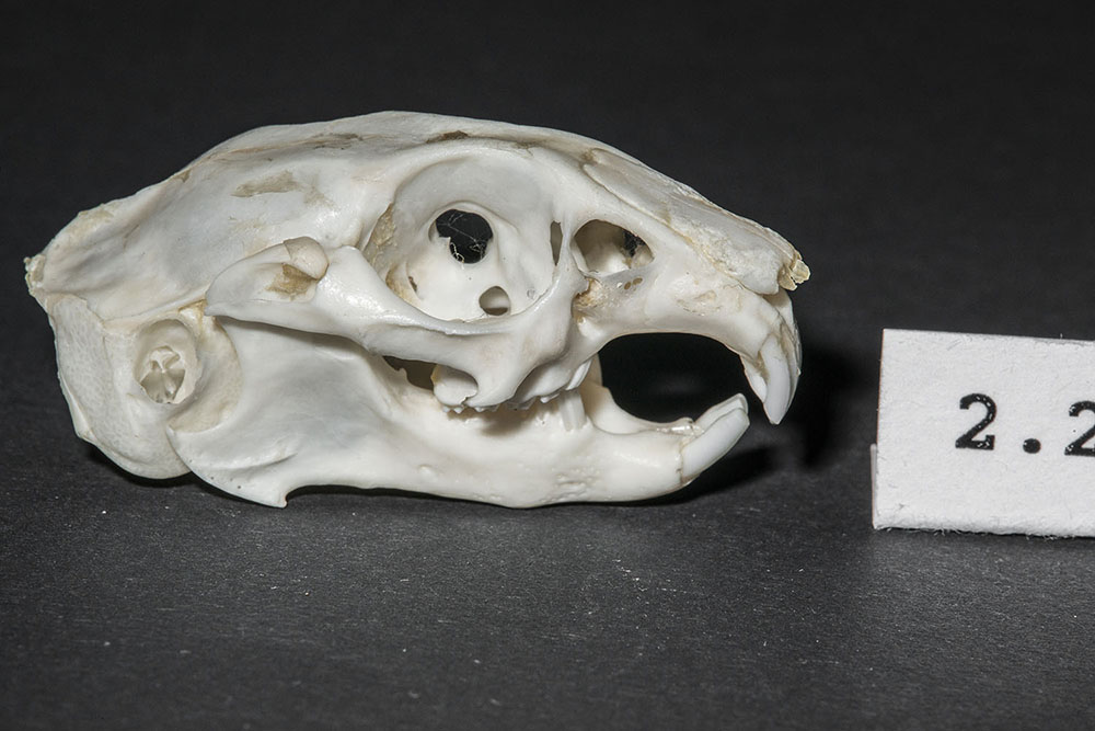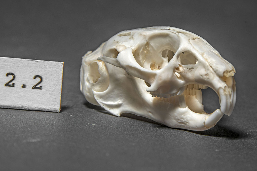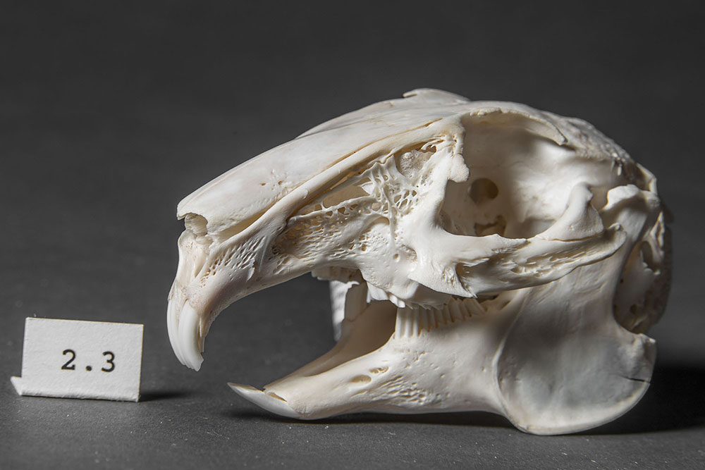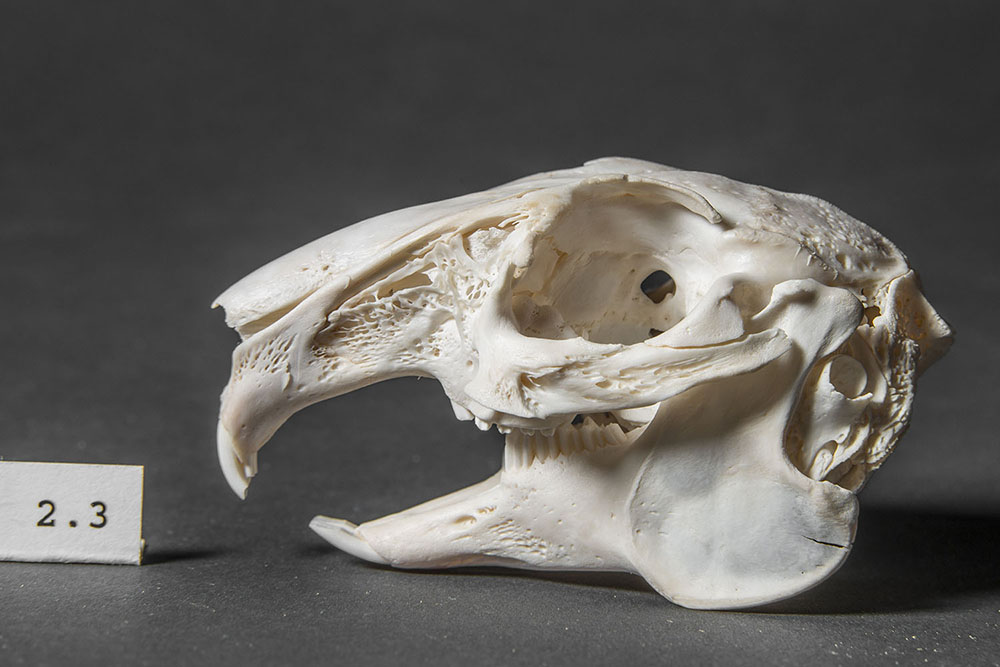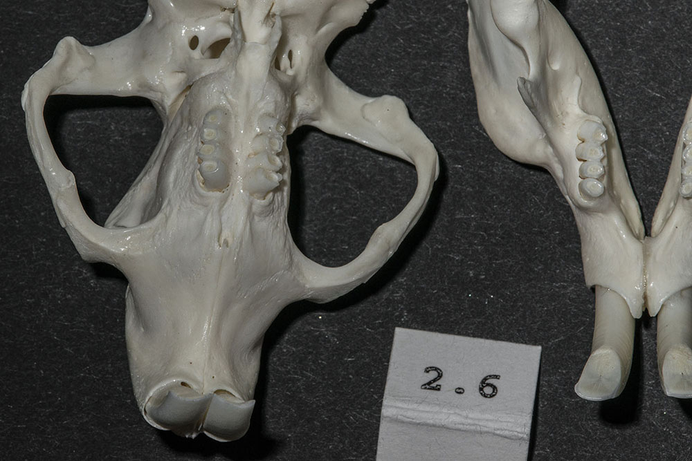 Klokan rudokrký Macropus rufogriseus (1.2), vakoveverka páskovaná Dactylopsila trivirgata (1.3) a vačice virginská Didelphis virginiana (1.4) jsou vačnatci. Vačnatci mívají oproti placentálům menší mozkovny a v horní čelisti více řezáků než v čelisti dolní. V jedné zubní řadě mají také menší počet třenových zubů (3 místo 4) a větší počet stoliček (4 místo 3). Jednoduchým znakem pro rozlišení obou skupin je dovnitř zahnutý angulární výběžek spodní čelisti vačnatců (srovnej např. s králíkem 2.2). Lebka klokana je příkladem býložravého vačnatce, který se živí potravou způsobující vyšší obrus zubů. Čelisti jsou zkrácené, dva dolní řezáky velké a chrup redukovaný s nápadnou mezerou za řezáky (diprotodontní chrup). Naopak na lebce vačice virginské jsou nápadné nezkrácené čelisti s větším počtem nespecializovaných řezáků a tvarově rozrůzněnými ostatními zuby (polyprotodontní chrup).