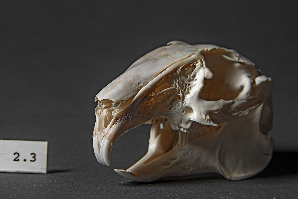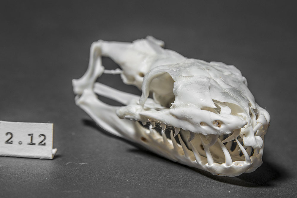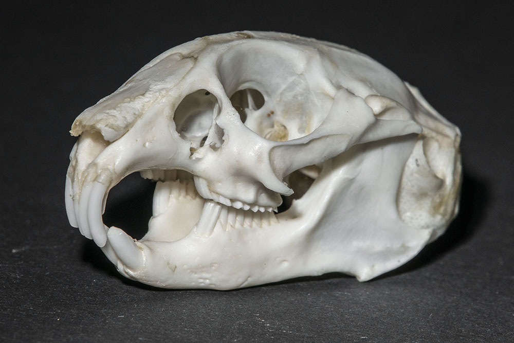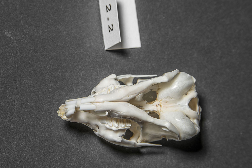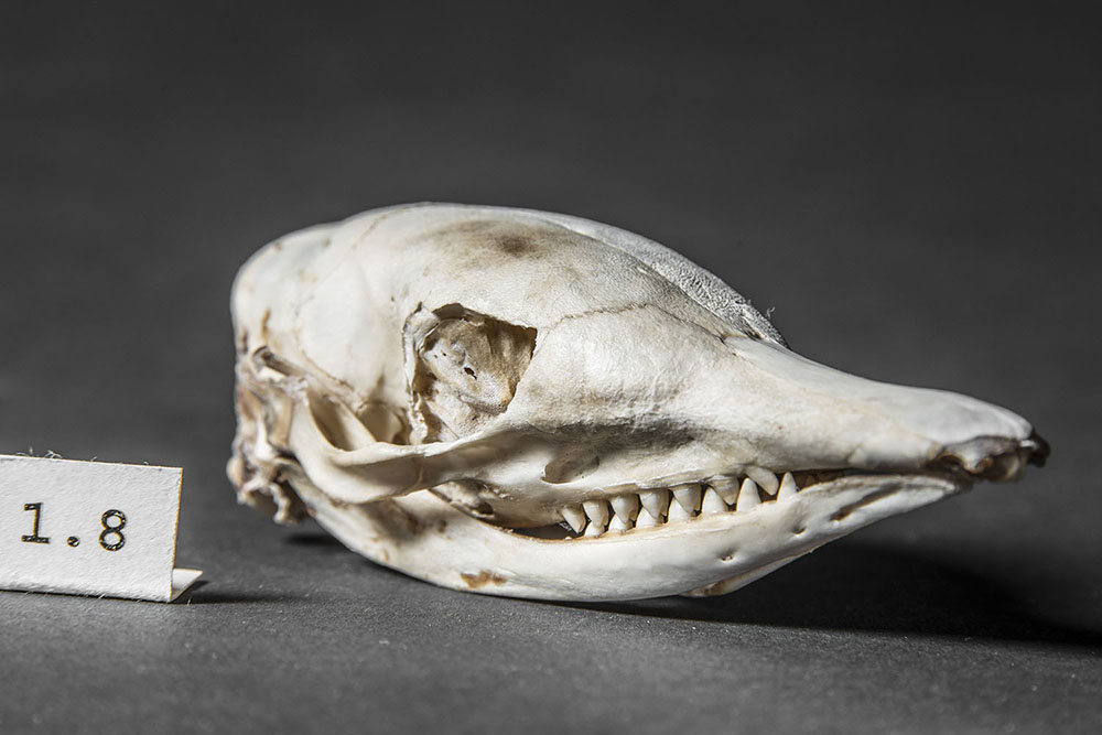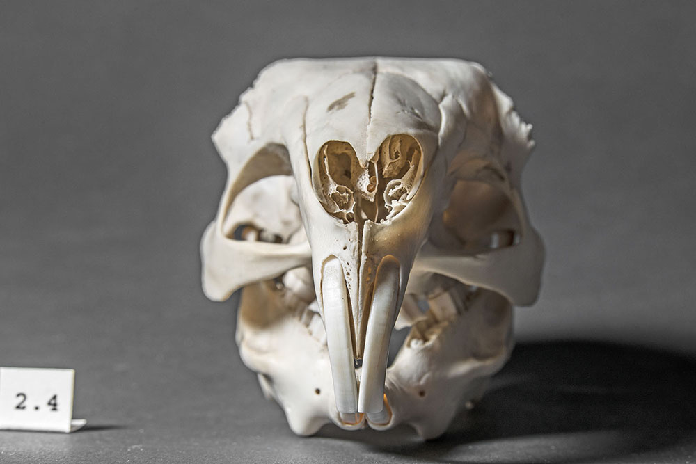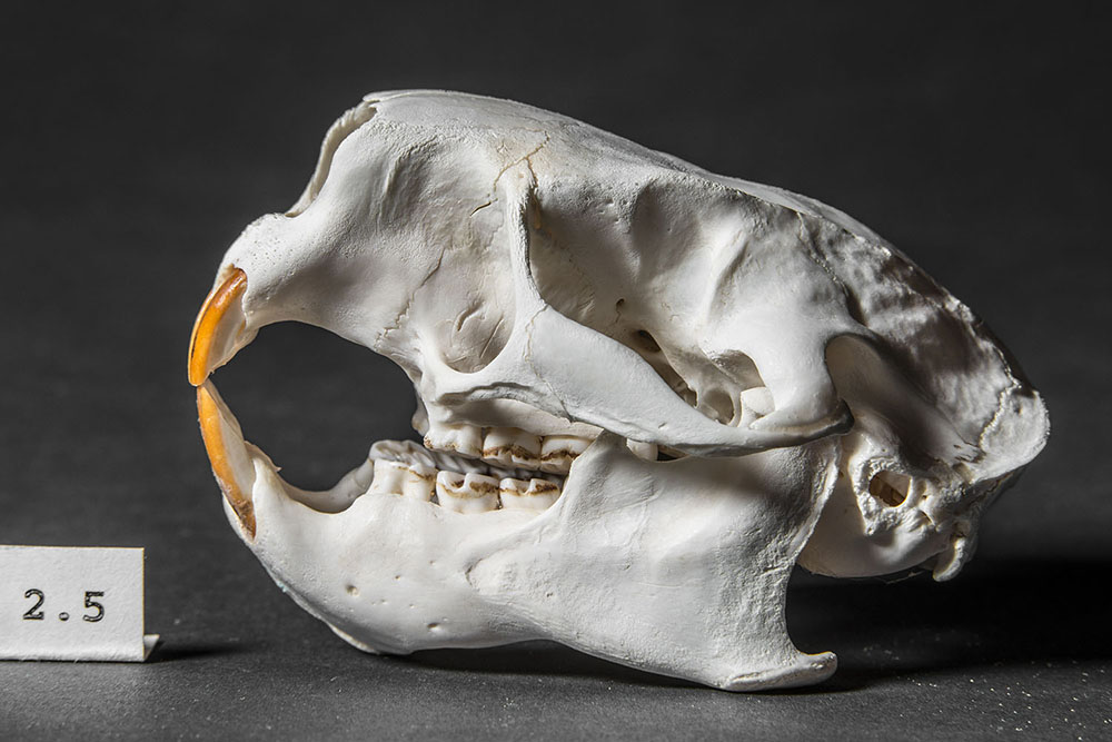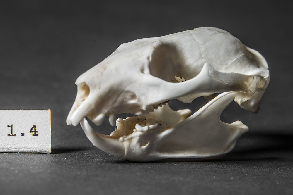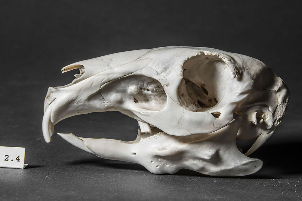 Klokan rudokrký Macropus rufogriseus (1.2), vakoveverka páskovaná Dactylopsila trivirgata (1.3) a vačice virginská Didelphis virginiana (1.4) jsou vačnatci. Vačnatci mívají oproti placentálům menší mozkovny a v horní čelisti více řezáků než v čelisti dolní. V jedné zubní řadě mají také menší počet třenových zubů (3 místo 4) a větší počet stoliček (4 místo 3). Jednoduchým znakem pro rozlišení obou skupin je dovnitř zahnutý angulární výběžek spodní čelisti vačnatců (srovnej např. s králíkem 2.2). Lebka klokana je příkladem býložravého vačnatce, který se živí potravou způsobující vyšší obrus zubů. Čelisti jsou zkrácené, dva dolní řezáky velké a chrup redukovaný s nápadnou mezerou za řezáky (diprotodontní chrup). Naopak na lebce vačice virginské jsou nápadné nezkrácené čelisti s větším počtem nespecializovaných řezáků a tvarově rozrůzněnými ostatními zuby (polyprotodontní chrup).