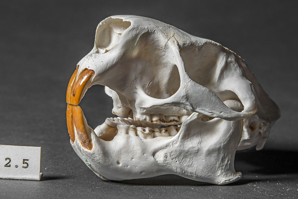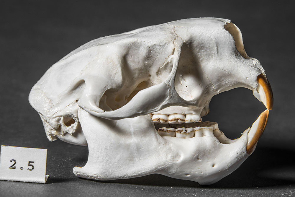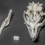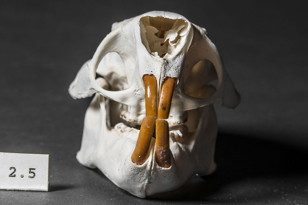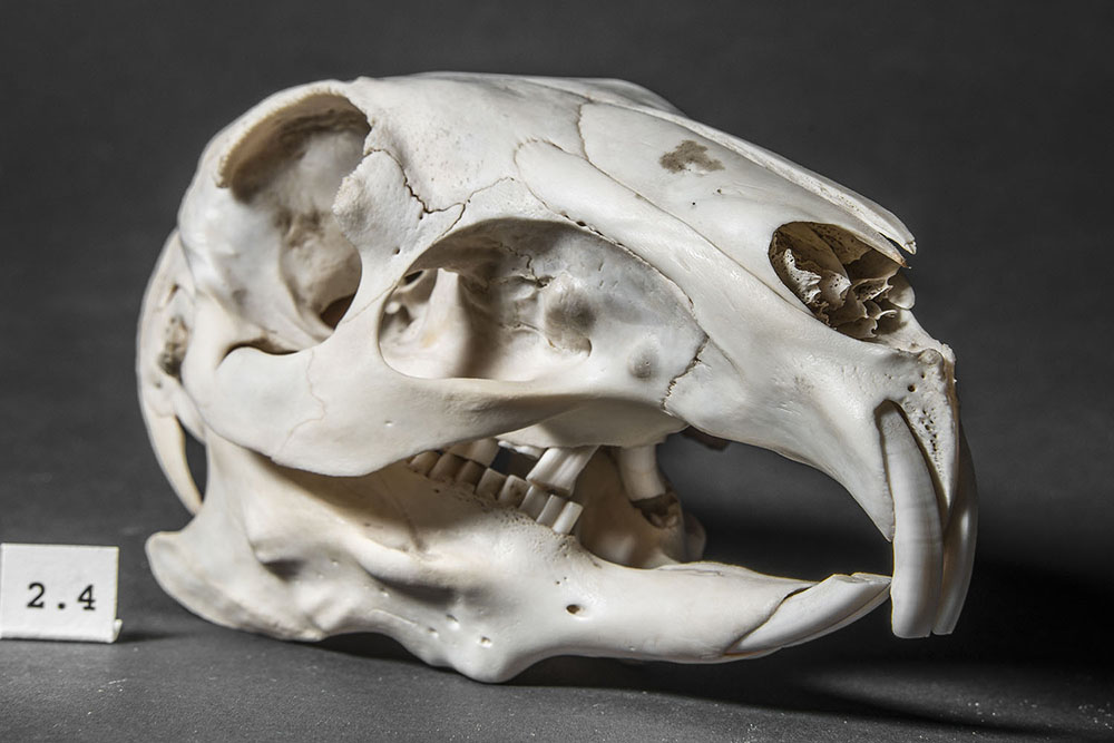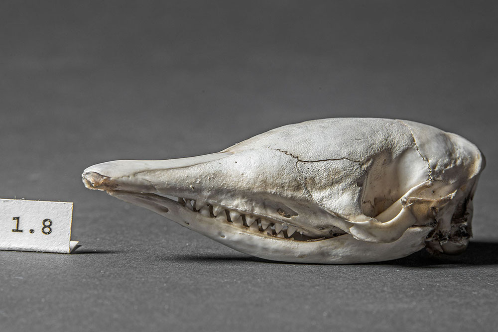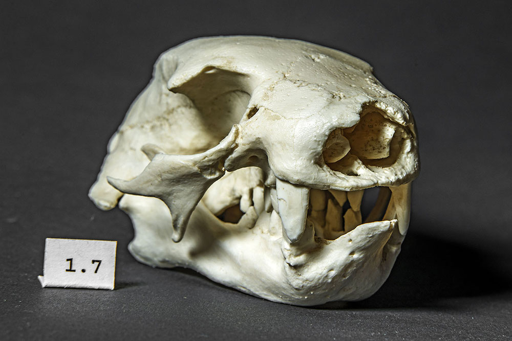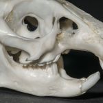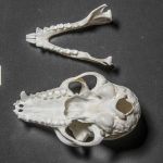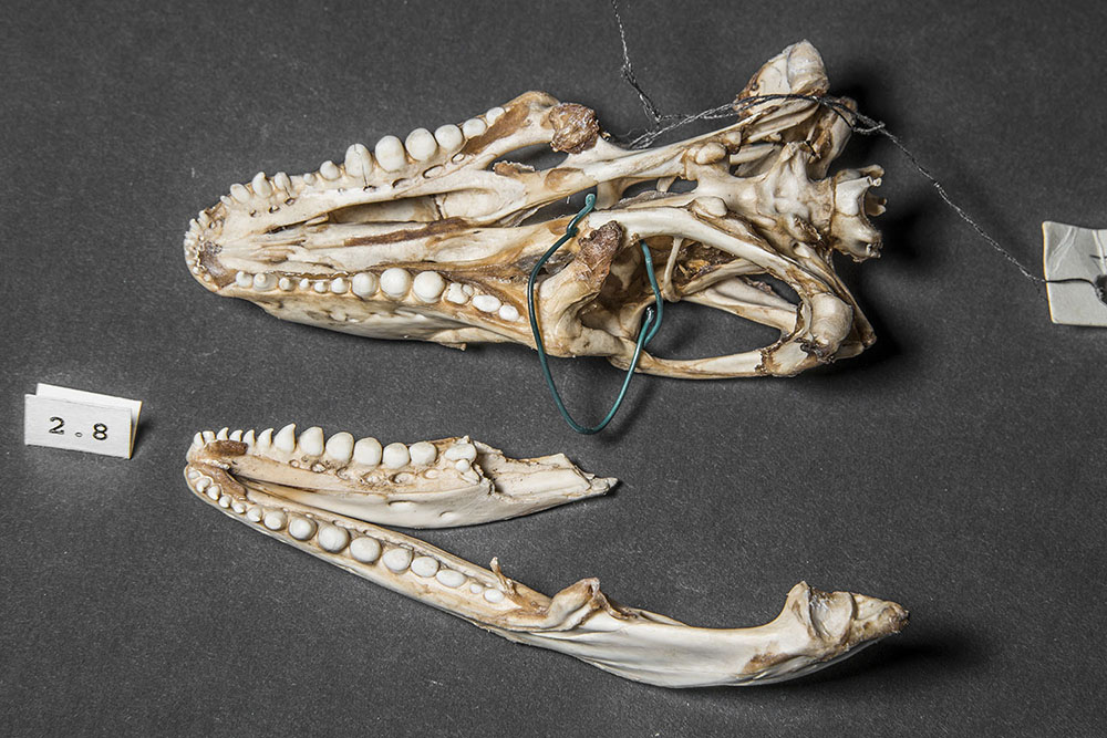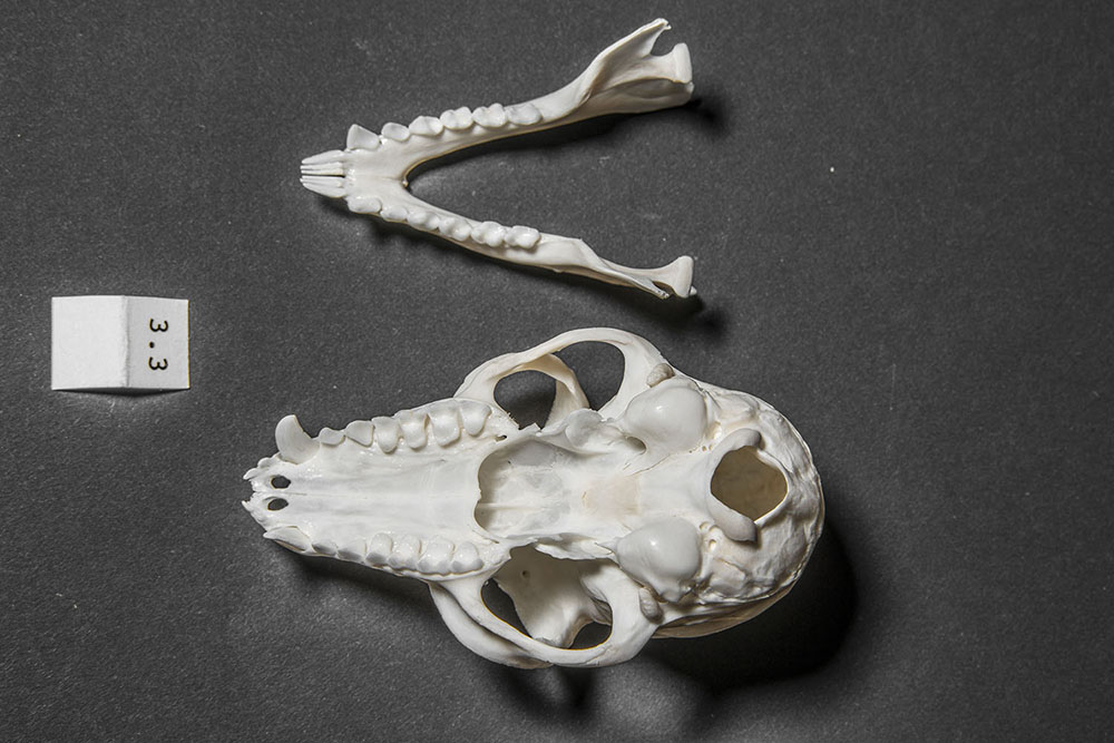 Klokan rudokrký Macropus rufogriseus (1.2), vakoveverka páskovaná Dactylopsila trivirgata (1.3) a vačice virginská Didelphis virginiana (1.4) jsou vačnatci. Vačnatci mívají oproti placentálům menší mozkovny a v horní čelisti více řezáků než v čelisti dolní. V jedné zubní řadě mají také menší počet třenových zubů (3 místo 4) a větší počet stoliček (4 místo 3). Jednoduchým znakem pro rozlišení obou skupin je dovnitř zahnutý angulární výběžek spodní čelisti vačnatců (srovnej např. s králíkem 2.2). Lebka klokana je příkladem býložravého vačnatce, který se živí potravou způsobující vyšší obrus zubů. Čelisti jsou zkrácené, dva dolní řezáky velké a chrup redukovaný s nápadnou mezerou za řezáky (diprotodontní chrup). Naopak na lebce vačice virginské jsou nápadné nezkrácené čelisti s větším počtem nespecializovaných řezáků a tvarově rozrůzněnými ostatními zuby (polyprotodontní chrup).