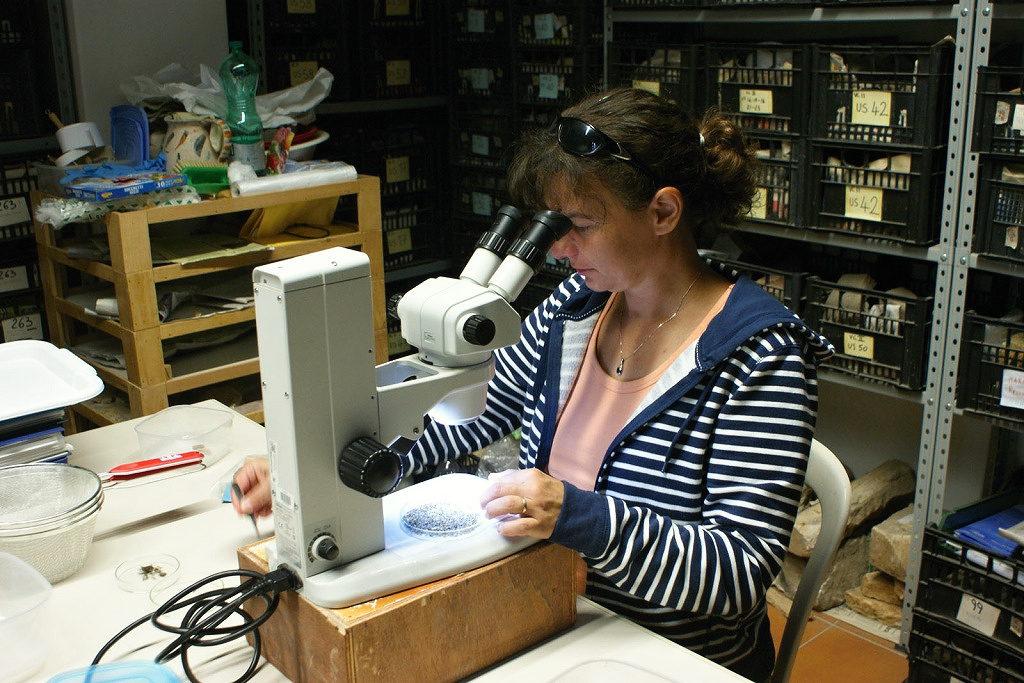 Klára Paclíková rozebírá sediment jedné z nádob s dochovanou výplní.