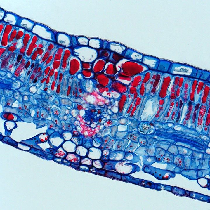 Cross-section of a poplar leaf, stained using the Masson Trichrome technique. The cross-section shows red palisade and blue spongy parenchyma and a vascular bundle in the middle. The photograph was taken during work on a project by Dagmar Sirová, Hydrobiological Institute, Biology Center of the Czech Academy of Sciences.