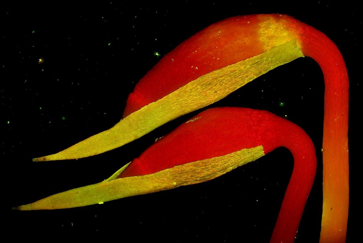 Flamingos in space or moss capsules (Plagiomnium sp.) under a fluorescence microscope.