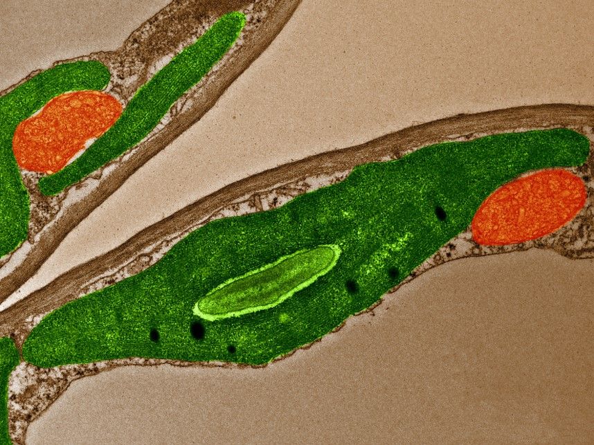 Cross-section of a leaf of the alpine shrub Ajania fructiculosa under a transmission electron microscope. The green color indicates chloroplasts, orange indicates multi-vesicular bodies. In collaboration with Alexey Bondar, Laboratory of Microscopy and Histology, Entomological Institute, Biology Center of the Czech Academy of Sciences, on a project by Jiří Doležal, Botanical Institute of the Czech Academy of Sciences, Třeboň Branch.