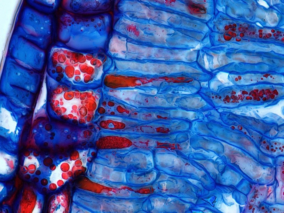 Detailed image of a poplar leaf section, stained using the Masson Trichrome technique. The photograph was taken during work on a project by Dagmar Sirová, Hydrobiological Institute, Biology Center of the Czech Academy of Sciences.