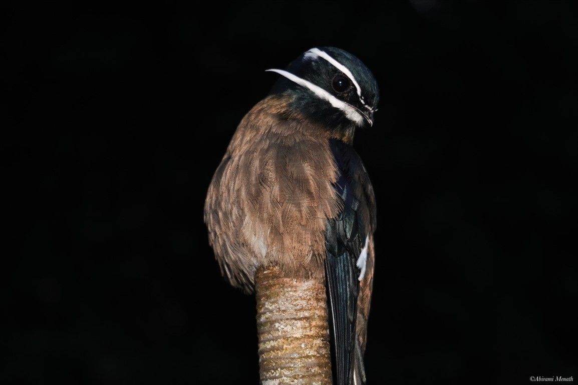 Whiskered Treeswift perching alertly in Danum Valley, its crisp white facial stripes and sleek plumage sharply outlined against the dark forest backdrop.
