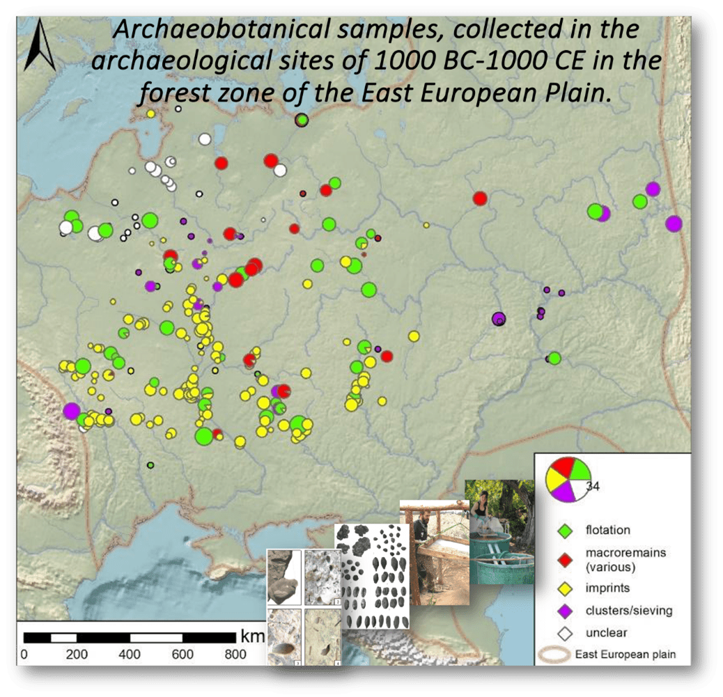 Julia Salova and her team compiled data on 837,803 plant macroremains and their inclusions in archaeological pottery from 321 archaeological sites in the forest and forest-steppe zones of Eastern Europe, spanning from the Baltic to the Urals and which have been collected and studied in over a century of archaeobotanical research. The spatiotemporal distribution of these remains was analysed using multivariate statistics, unveiling intricate cultivation patterns influenced by climatic and historical factors. Published research demonstrates the potential to discern trends in cereal production by combining data from various research methods. All published archaeobotanical data have been compiled into a special geodatabase. The database is allocated at the British Archaeology Database Service (University of York) and includes the work of Eastern European archaeobotanists over the last hundred years.